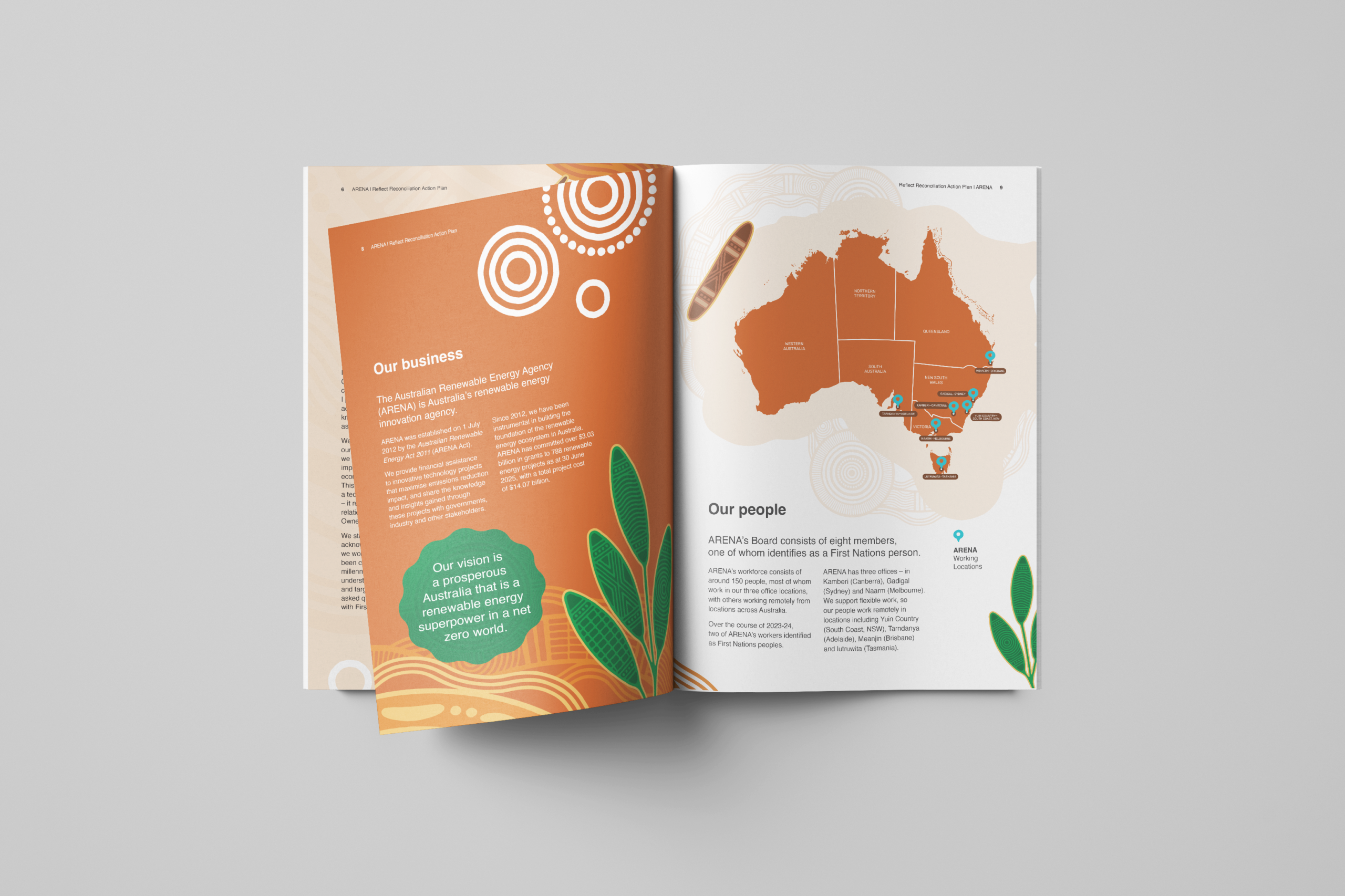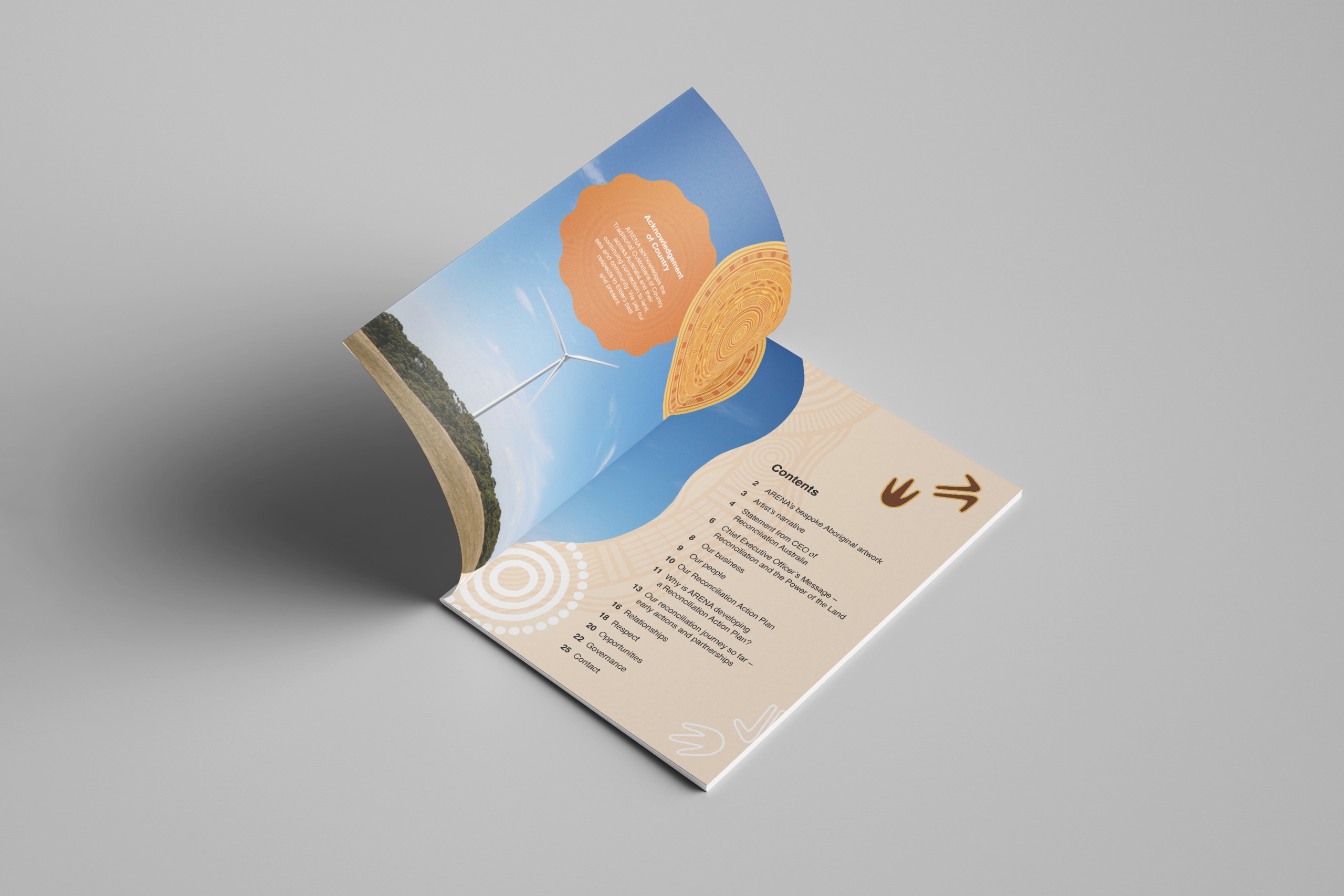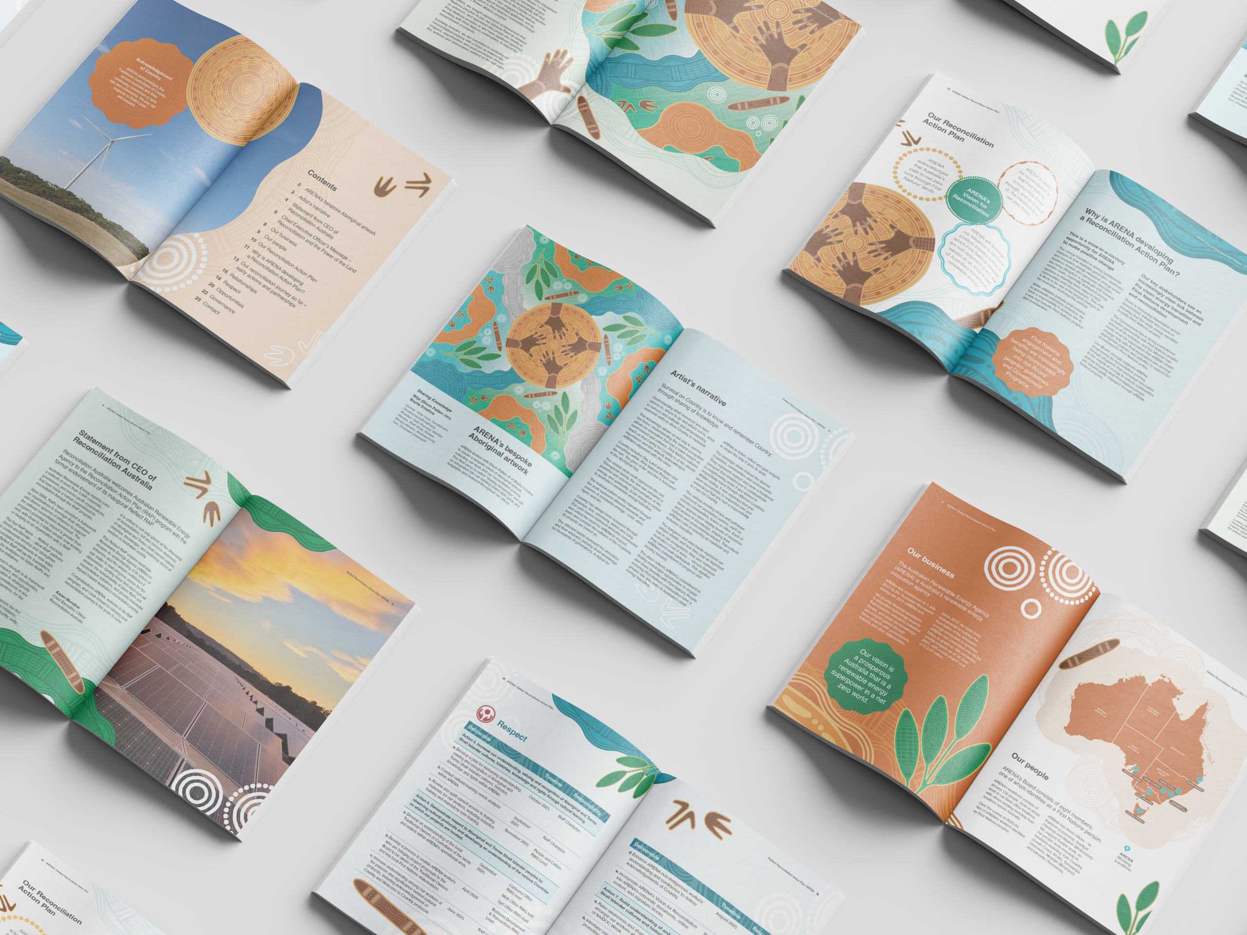ARENA commissioned Bayila Creative to create an artwork reflecting ARENA’s work and reconciliation journey, for use across the RAP. The artwork is ‘Sharing Knowledge’ by Bitja, Dixon Patten Jnr. Little Rocket carefully designed the RAP and additional assets following the comprehensive artwork style guide provided by Bayila Creative.