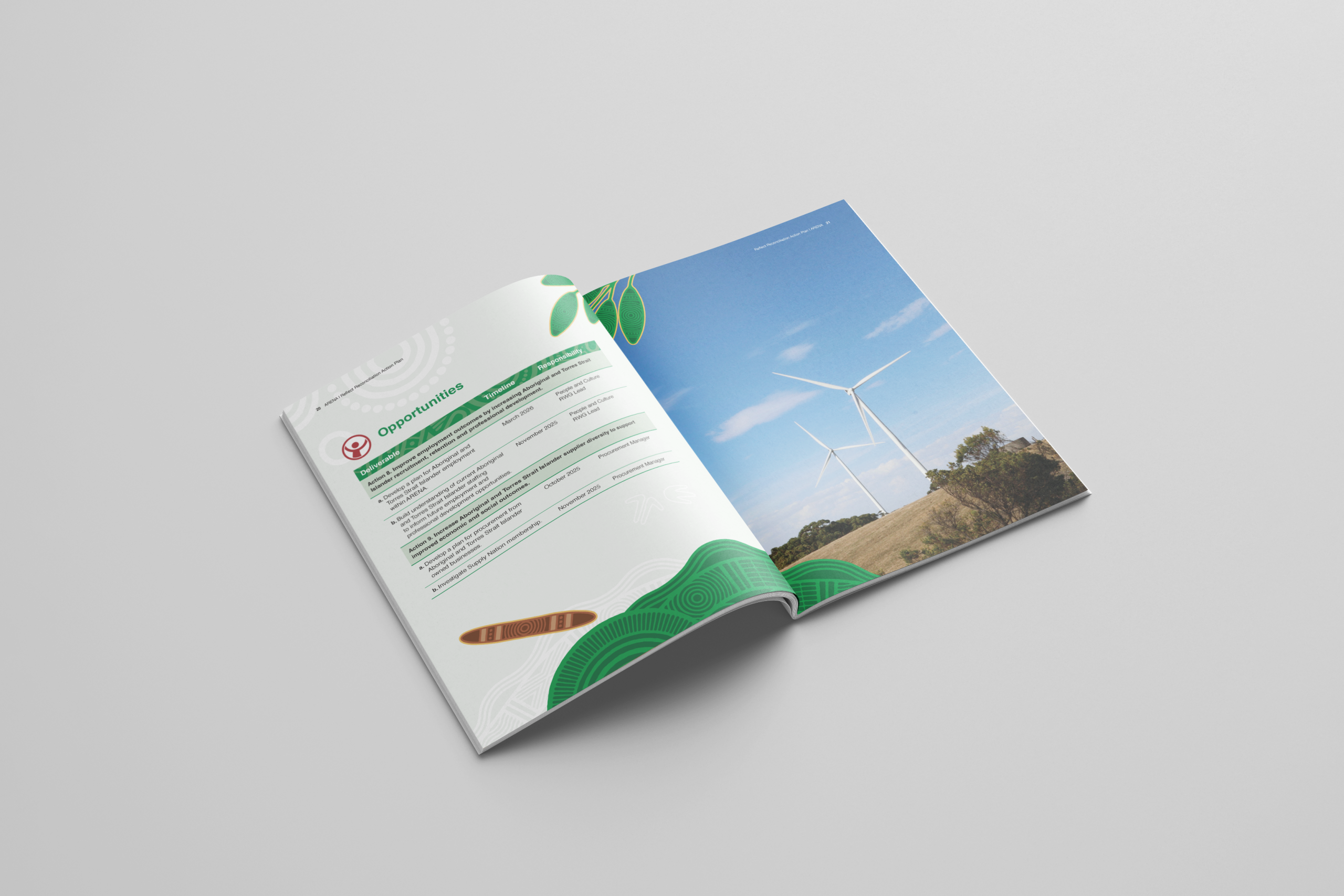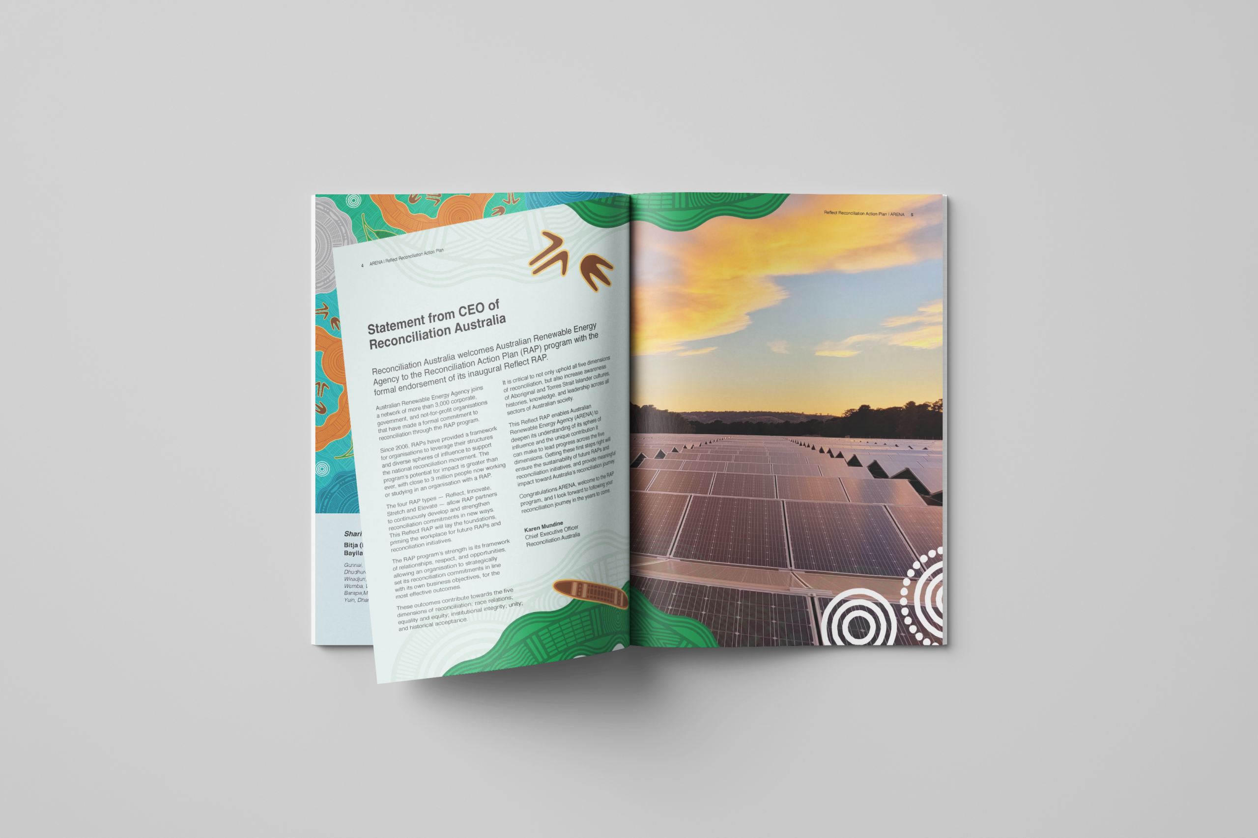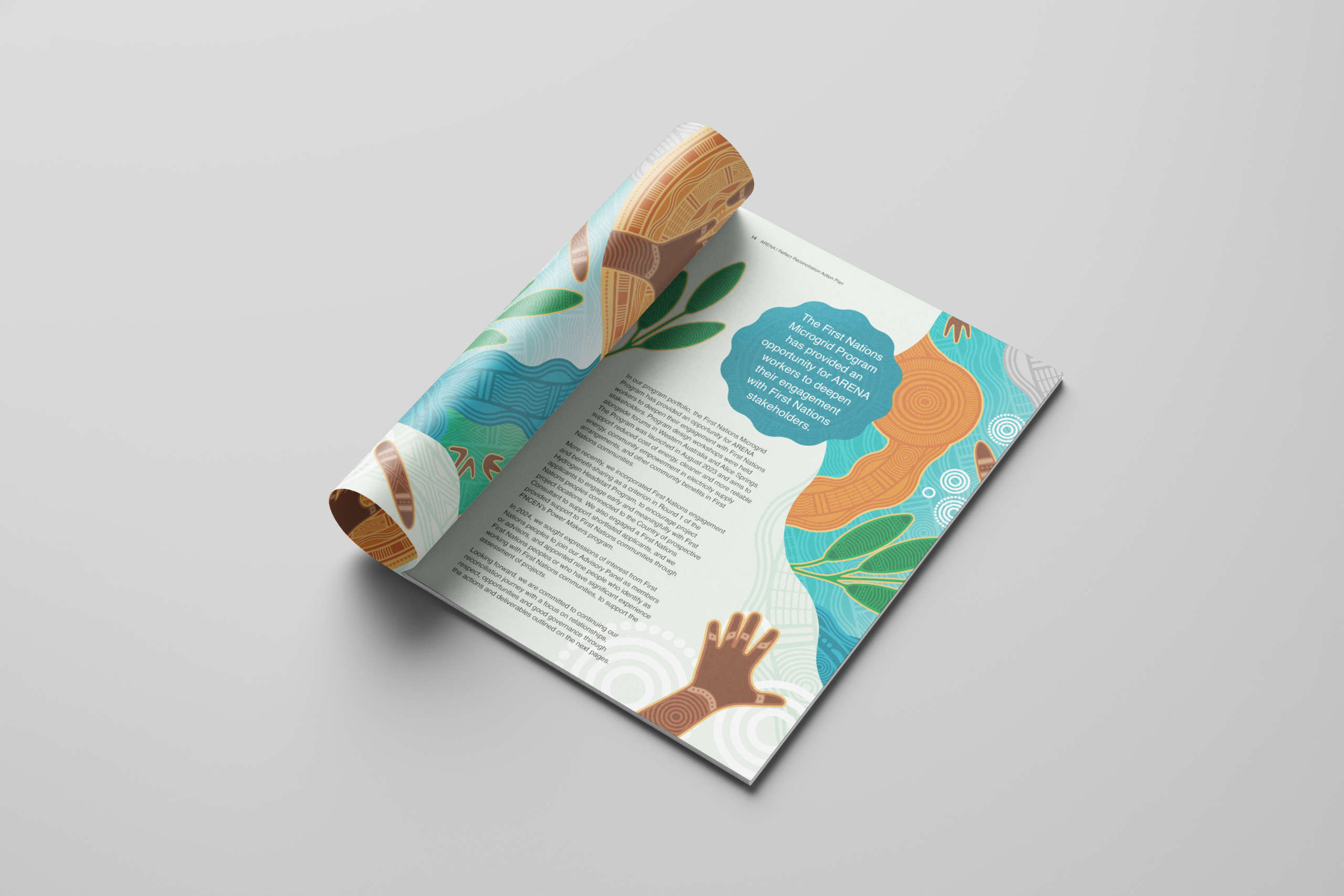 ARENA commissioned Bayila Creative to create an artwork reflecting ARENA’s work and reconciliation journey, for use across the RAP. The artwork is ‘Sharing Knowledge’ by Bitja, Dixon Patten Jnr. Little Rocket carefully designed the RAP and additional assets following the comprehensive artwork style guide provided by Bayila Creative.